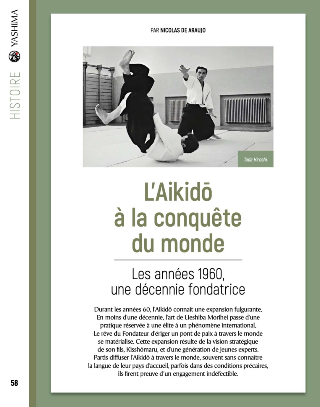 Pour ma part, vous découvrirez dans ce numéro, la seconde partie de mon article dédié au développement international de l'Aïkido et intitulé "L’Aikidō à la conquête du monde" consacrée aux années 1960. En moins d’une décennie, l’art fondé par Morihei Ueshiba passe d’une pratique réservée à une élite à un phénomène international. Le rêve du Fondateur d’ériger « un pont reliant le monde des humains à la paix » se matérialise.